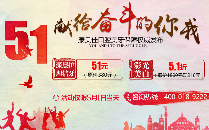 康贝佳口腔特在五一劳动节推出“献礼奋斗的你我”美齿特惠活动,并联合吴博士发布美牙保障,对奋斗的劳动人民致以更崇高的敬意。美齿购实惠,优选康贝佳!