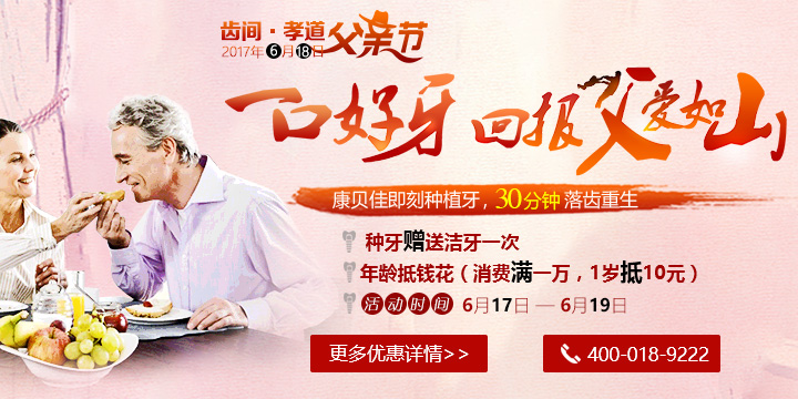 随着人们对种植牙的深入了解,越来越多的人们开始选择给父母种牙,让他们能更好的享受美食,拥有健康。为了鼓励更多孝敬的儿女送父亲一口好牙,康贝佳口腔父亲节当天所有来院进行种植牙的顾客均尊享种植牙特惠。其中: