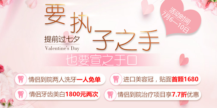 康贝佳口腔特在“七夕节”来临前夕公历7月6日-9日,举办情人节预热优惠活动,让大家提前感受七夕情人节的氛围。再者七夕马上就要到了,想想如果你们正浪漫,却因为露出的丑牙破坏了气氛,尴不尴尬?我们需要做的,在七夕来临之前,提前做好“功课”,扫除一切影响七夕的障碍。》》》点击查看七夕康贝佳美牙优惠