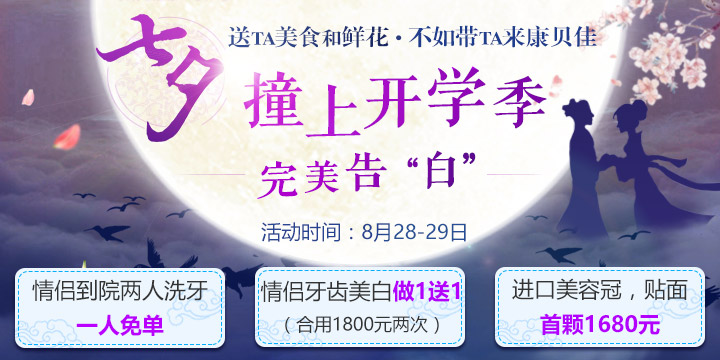 发布日期:2018-04-13 来源:沈阳康贝佳口腔眼看着马上就要开学了,更更关键的,连七夕情人节也要到了!七夕节遇上开学季,如果在这样的日子向TA表白,想想就非常有意义呢。康贝佳口腔已经为你精心准备好了,七夕鹊桥惠与欢乐开学季一大波优惠满足你。带上心爱的TA来康贝佳,给她一个不一样的惊喜。