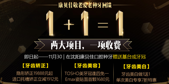 康贝佳口腔1+1=1感恩回馈计划,两大项目,一项收费。即日起——11月30日,在康贝佳种牙即送价值1500元的牙冠或价值2300元复合基台。康贝佳祝您轻松、实惠种好牙。>>>优惠详情咨询