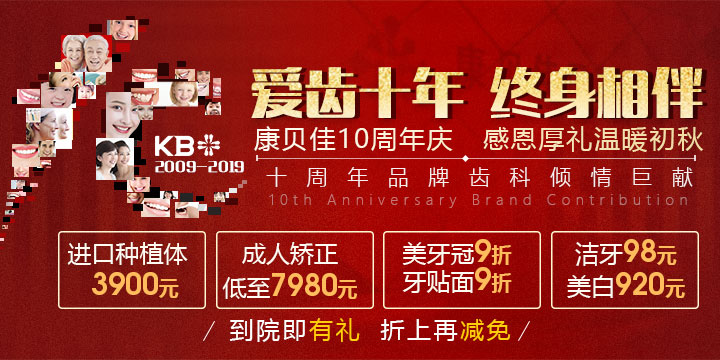 康贝佳口腔连锁作为口腔行业的先行者,多年来以全社会口腔健康为己任,时至今年9月,已走过整整十个年头。在集团总部十周年十院同庆期间,沈阳院襄逢盛举,特推出感恩答谢活动;同时,为以身作则推动全民口腔健康事业,在“9.20国际爱牙日”这个特殊的时期,康贝佳制定了一系列“救牙计划”优惠活动。康贝佳九月份拟实行“到院即有礼、折上再减免”的到院礼+特惠礼+答谢礼多重优惠政策,共同推广全民口腔保健观念,减轻患者救牙健齿负担。<<<报名参与活动领取好礼