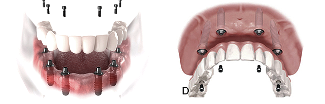 “ALL-on-4/6种植技术”是目前比较常用的半口及全口种植技术,仅需将4/6颗种植体,以倾斜角度植入牙槽骨内,然后在基台上安装“拱形连桥”牙冠,这样种植牙的受力就呈现“拱形”的特征,以少种多,这样对于患者来说也相对比较实惠。