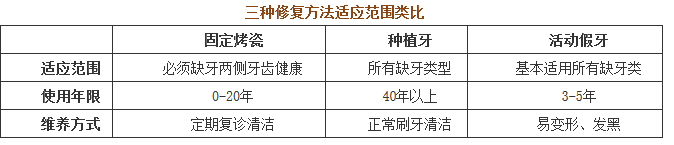 三种修复的方法和价格各不相同,又各有优势,能满足不同缺牙患者的需求,需根据自己的实际情况(年龄、牙缺失颗数、部位)来选择适合自己的镶牙方式:>>>点击咨询自己适合哪种方式